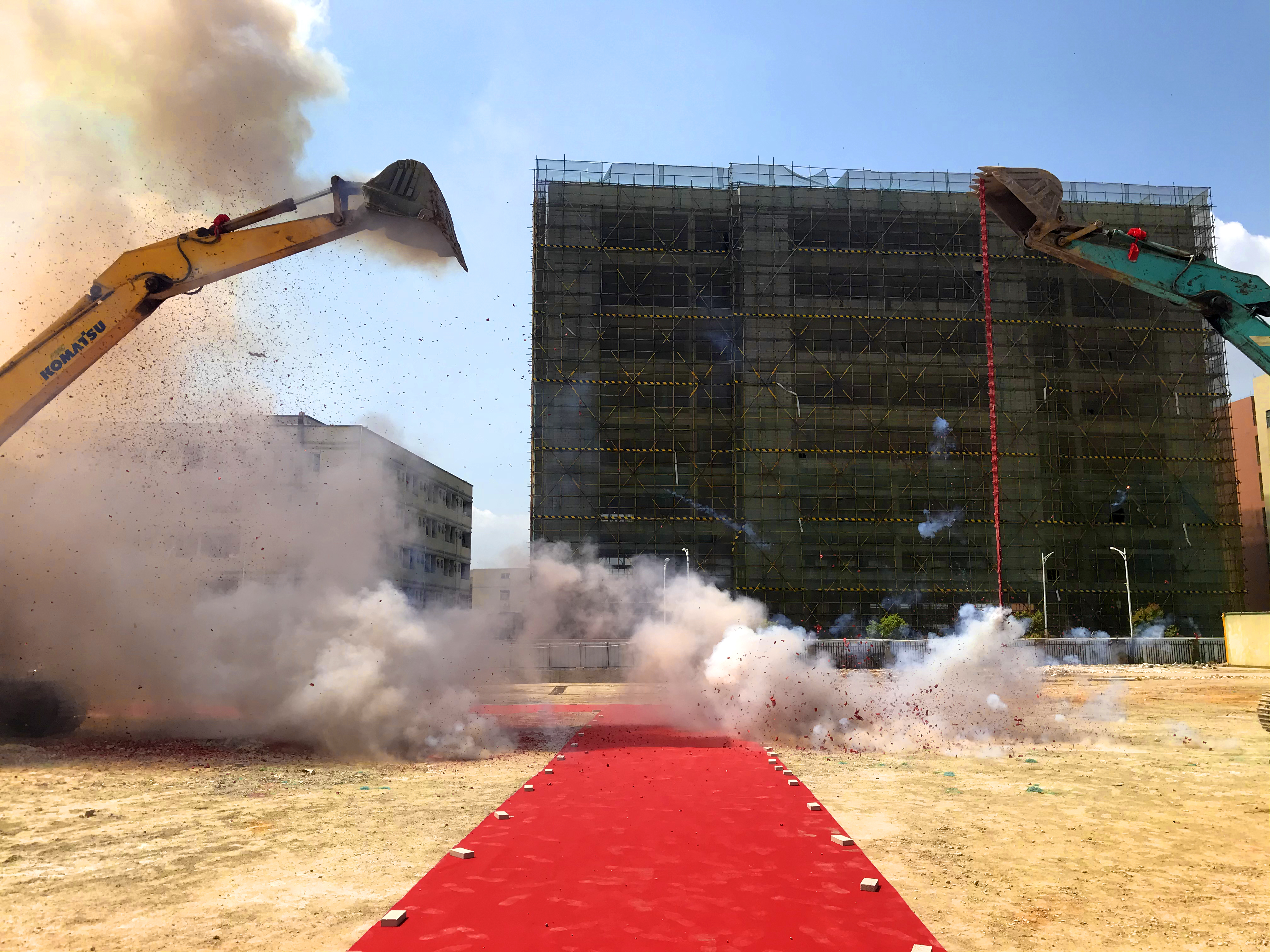 活動現場布置簡單而樸素、氣氛隆重而熱烈。伴隨著禮花滿天和禮炮齊鳴,麥照華董事長一行與其它領導嘉賓一起手持金鍬,共同為鴻銘電子科技智造產業園項目培土奠基,預示項目正式進入施工建設的全新里程。