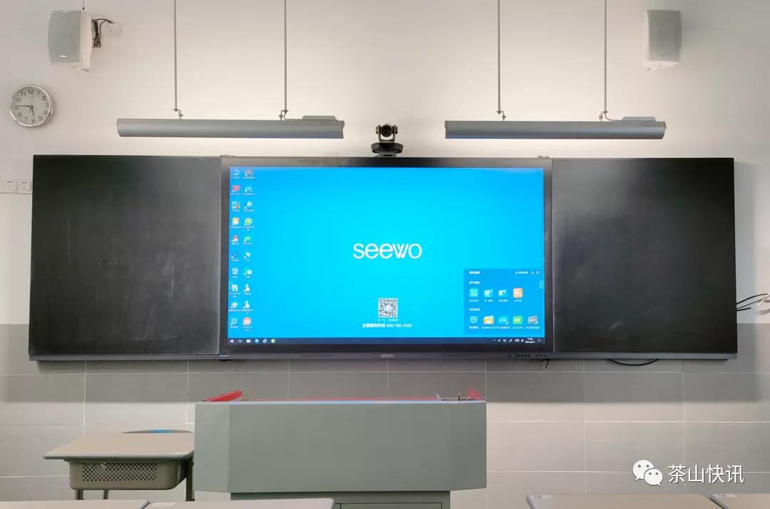▲教室內(nèi)安裝的教學(xué)一體機、納米黑板及高清錄播系統(tǒng)